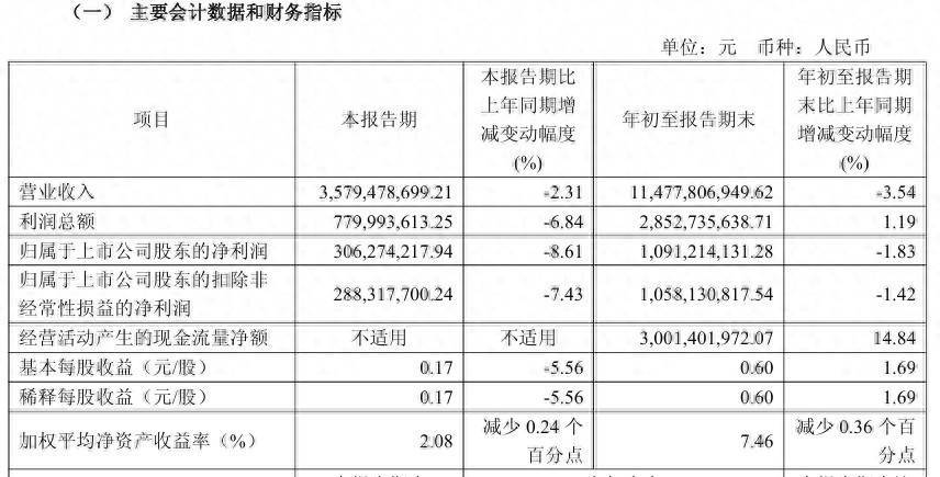 其中第三季度,公司营业收入为35.8亿元,同比下降2.3%;归母净利润为3.06亿元,同比下降8.6%;扣非归母净利润为2.88亿元,同比下降7.4%;EPS为0.1674元。